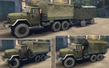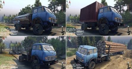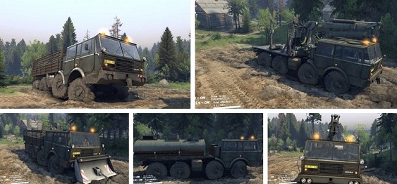 Моды грузовиков для Spin Tires 2015. Грузовик заменяет ЗиЛ, а звук использует ураловский. Он имеет анимацию подвески, рамы и запаски, кабины и мелкая анимация прочего. У него есть свои аддоны - сцепка, контейнер и цистерна, при которых меняется модель грузовика, стандартные тоже использует.