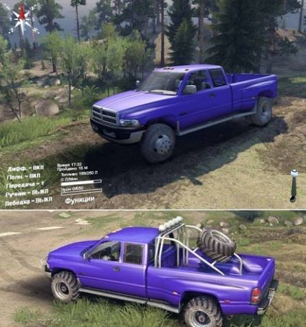 Мод Dodge Ram 3500 с некоторыми анимациями имеет пару аддонов и пару комплектов сменных колёс - вездеходные. Он в игре заменяет уаз, а звук использует свой.