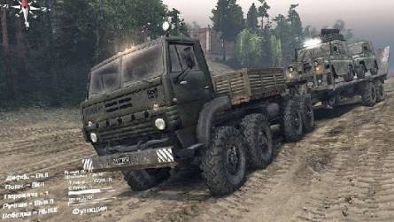 Мод КамАЗ 4326 4х4 - грузовик с анимированной подвеской и прочими частями. Имеет при себе два прицепа и пару комплектов сменных колёс. Он в игре заменяет Уаз, а звук использует свой - камазовский.